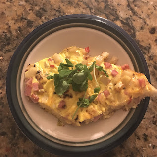 - Sauté the Canadian bacon, onion, bell pepper, and potatoes in a 10 inch skillet coated with cooking spray, until the vegetables are soft and the potatoes are lightly browned.